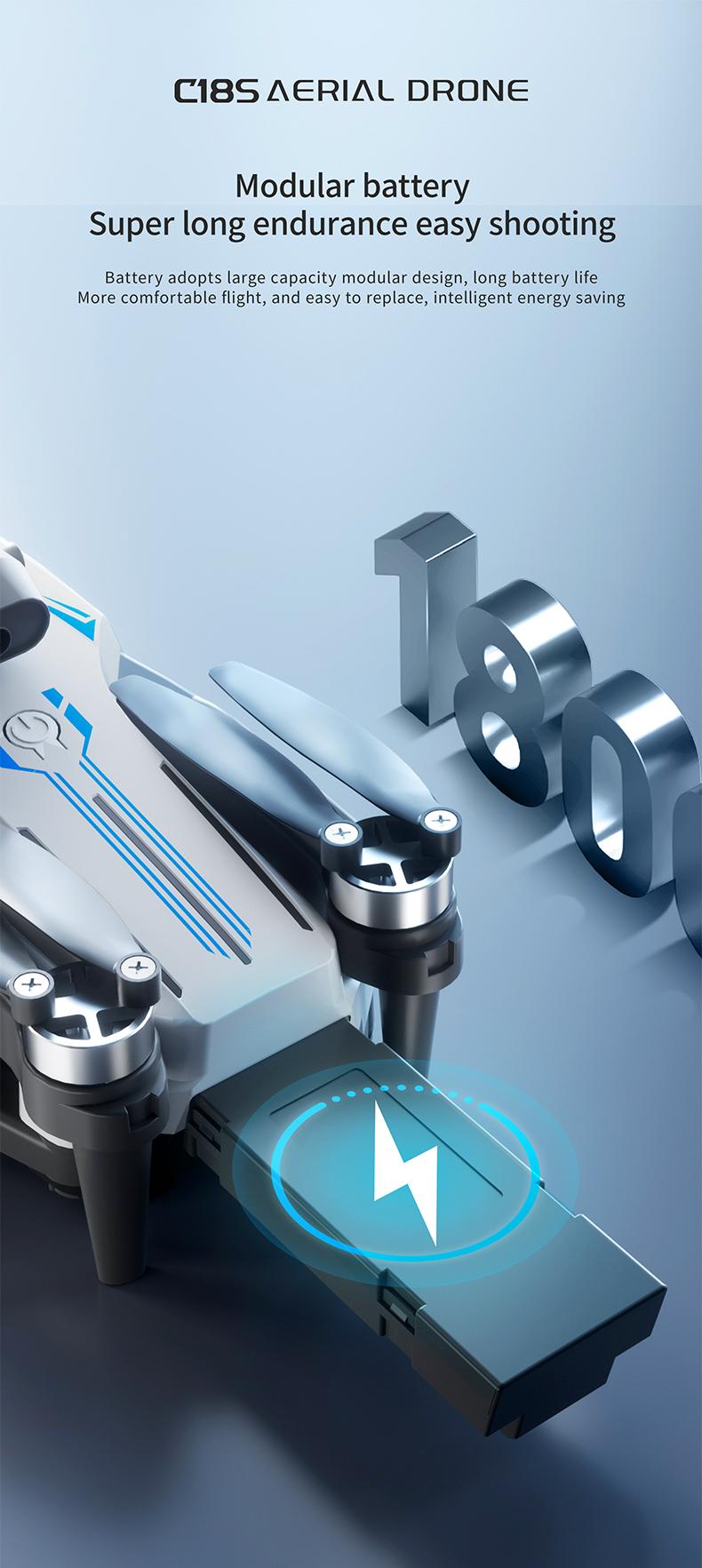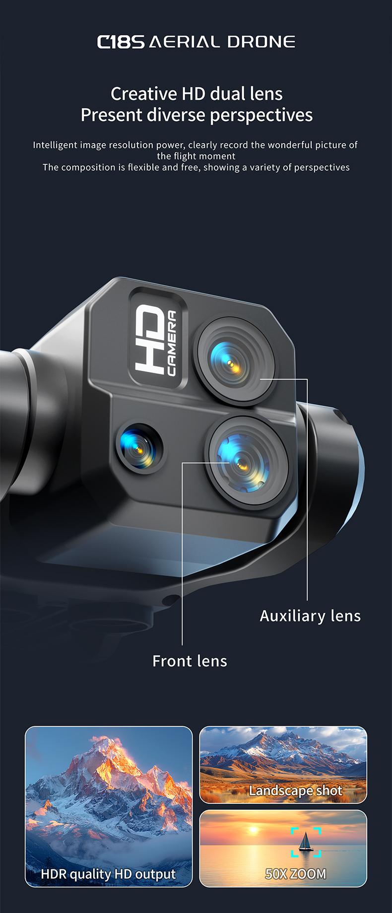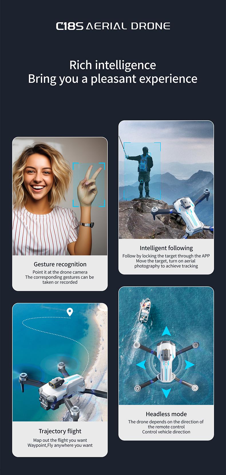 The Aerial Drone 2025 C18s Pro is equipped with a 4K UHD EIS Camera, ensuring clear and stable footage. It features GPS and 5G WiFi for precise location and smooth connectivity. The drone includes FPV Brushless Motors for efficient flight. Optical Flow technology enhances stability. Smart Obstacle Avoidance and Auto Return features ensure safe operation. It comes with 360° Stunt Roll for dynamic maneuvers. Dual Batteries provide extended flight time.